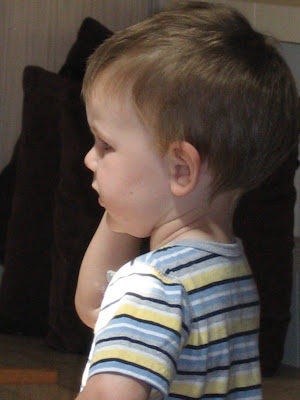 He just sits there and smiles or quietly laughs when he thinks that something is funny. I just had to get pictures because it is quite funny.